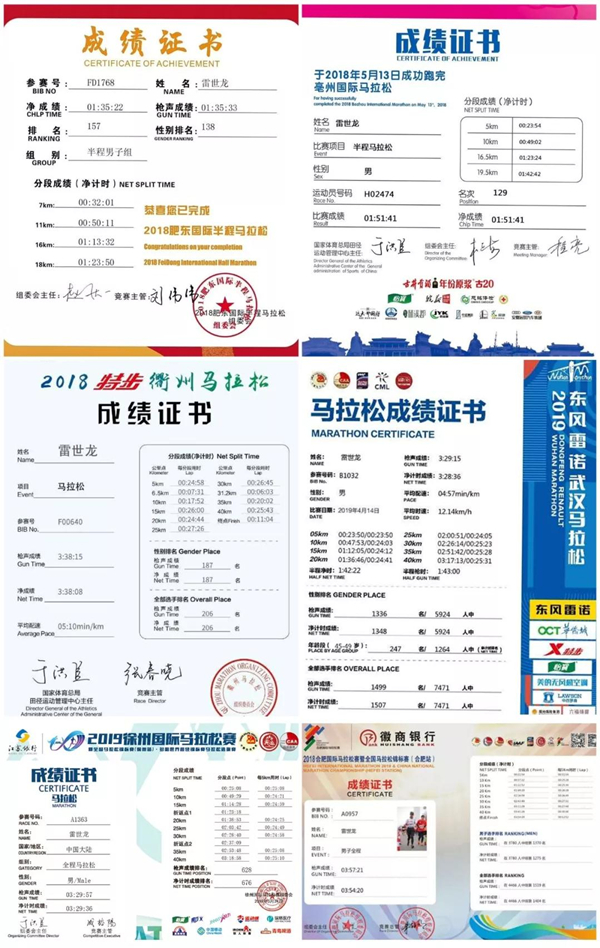 2017年,雷世龍開始接觸馬拉松運動,并加入合肥本地跑團,開始了自己的跑馬生涯。從2017年至今,雷世龍參加了大大小小二十多場馬拉松比賽,足跡遍布全國各地,其中包括多哈世界賽選拔賽徐州馬拉松比賽、中國四大滿貫賽事武漢馬拉松比賽等重要賽事,雷世龍憑借穩(wěn)定的實力和出色的發(fā)揮順利跑完全程并取得了優(yōu)異的名次。值得一提的是,雖然雷世龍正式接觸馬拉松只有兩年多,但他已成功全馬進入330(即3小時30分鐘內(nèi)跑完馬拉松全程),獲得精英選手成績,并因此得到國內(nèi)重要賽事直通名額。“過了今年我就五十歲了,但是我會一直跑下去,我的夢想是完成中國馬拉松大滿貫,我也正為此努力準備著。”