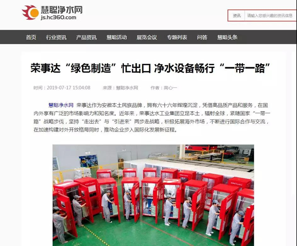 慧聰網(wǎng) 《榮事達(dá)“綠色制造”忙出口 凈水設(shè)備暢行“一帶一路”》