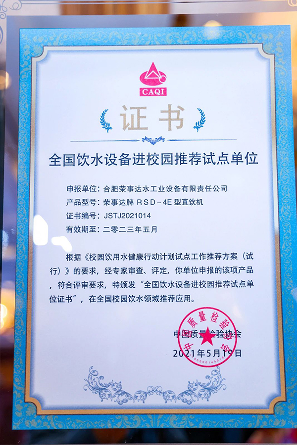 為推動飲水設備進校園工作持續性、健康性地發展,向消費者、學校和社會推薦好企業、好產品,2021年4月,中國質量檢驗協會開展了全國飲水設備進校園推薦試點單位工作,經企業自主報名、專家資料審查和網上公示,最終遴選了20家全國飲水設備進校園推薦試點單位,榮事達憑借過硬的產品和服務質量成功入選。會上,鄧瑞德理事長、魯建國所長、白雪濤所長、劉子玉主任分別為20家企業頒發了證書。