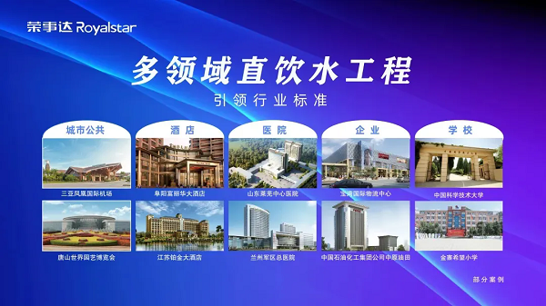 03 榮事達(dá)多領(lǐng)域直飲水工程 榮事達(dá)水工業(yè)公司作為凈水領(lǐng)域的佼佼者,已經(jīng)擁有二十年的行業(yè)積累。其產(chǎn)品覆蓋有千萬家庭、2000+企事業(yè)單位、3500+校園等場所。此外,榮事達(dá)水工業(yè)公司還獨(dú)立設(shè)計施工大型直飲水工程,包括秦始皇兵馬俑博物館、唐山世界園藝博覽會、三亞鳳凰國際機(jī)場、合福高鐵沿途站點(diǎn)等知名項目,以及埃塞俄比亞總統(tǒng)府、馬來西亞巴生港、贊比亞恩多拉機(jī)場、巴基斯坦默蒂亞里等海外項目,贏得了廣泛的贊譽(yù)和信賴。