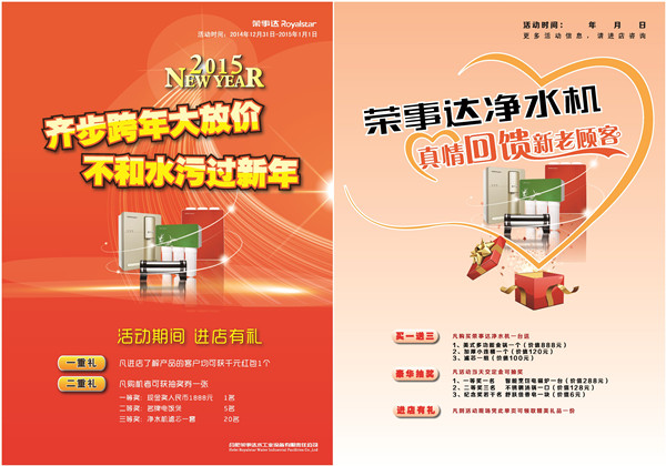 又至歲末,辭舊迎新,榮事達跨年獻禮,感恩回饋,再掀凈水狂潮。回首2014,居民飲水安全頻頻告急,安裝家用凈水機實現“純凈水自己造”,構筑飲水安全最后一道防線,成為居民生活頭等大事。為普及凈水,元旦期間,榮事達將在全國多個省份推行惠民政策,加強推廣凈水機的力度。顧客在元旦期間進店選購榮事達凈水機,可獲得超值大禮。逛店拿紅包——顧客進店咨詢產品信息,即可獲贈千元紅包;購機送好禮——購買榮事達純水機,可獲贈管線機、凈洗機等精美大禮;歡樂抽大獎——顧客現場購機可參加抽獎活動,現金大獎、名牌家電、濾芯套裝等各項大獎送不停。開心跨年,悅享凈水。新的一年,榮事達凈水機將以更優質的產品、更好的服務加速凈水普及,真正讓惠于民,讓廣大消費者喝上安全、健康的好水,提高居民生活品質。- [關閉] [打印]