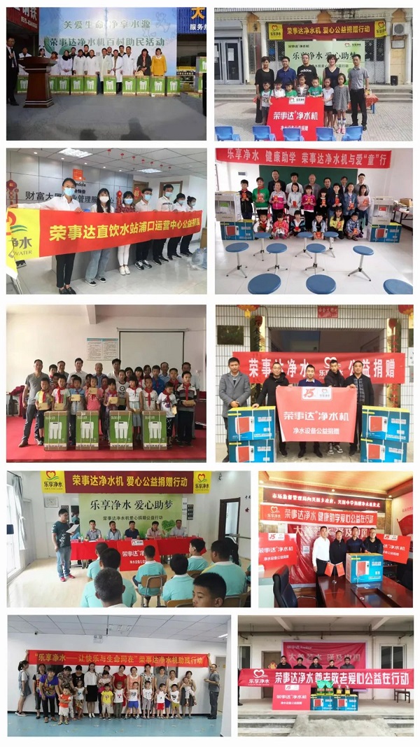 榮事達水工業(yè)經(jīng)銷商積極響應集團公益倡議,熱衷于健康助學、愛心敬老、愛心助殘、疫情防控等多種形式的公益行動,截止到目前,經(jīng)銷商們的公益活動已遍及安徽、南京、湖南、江蘇、陜西、江西、河南、河北等多個地區(qū),以健康好水,溫暖每一個城市。